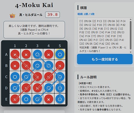 1プレイ1分程度で遊べるテーブルゲーム"4目並べ改"を公開しました。